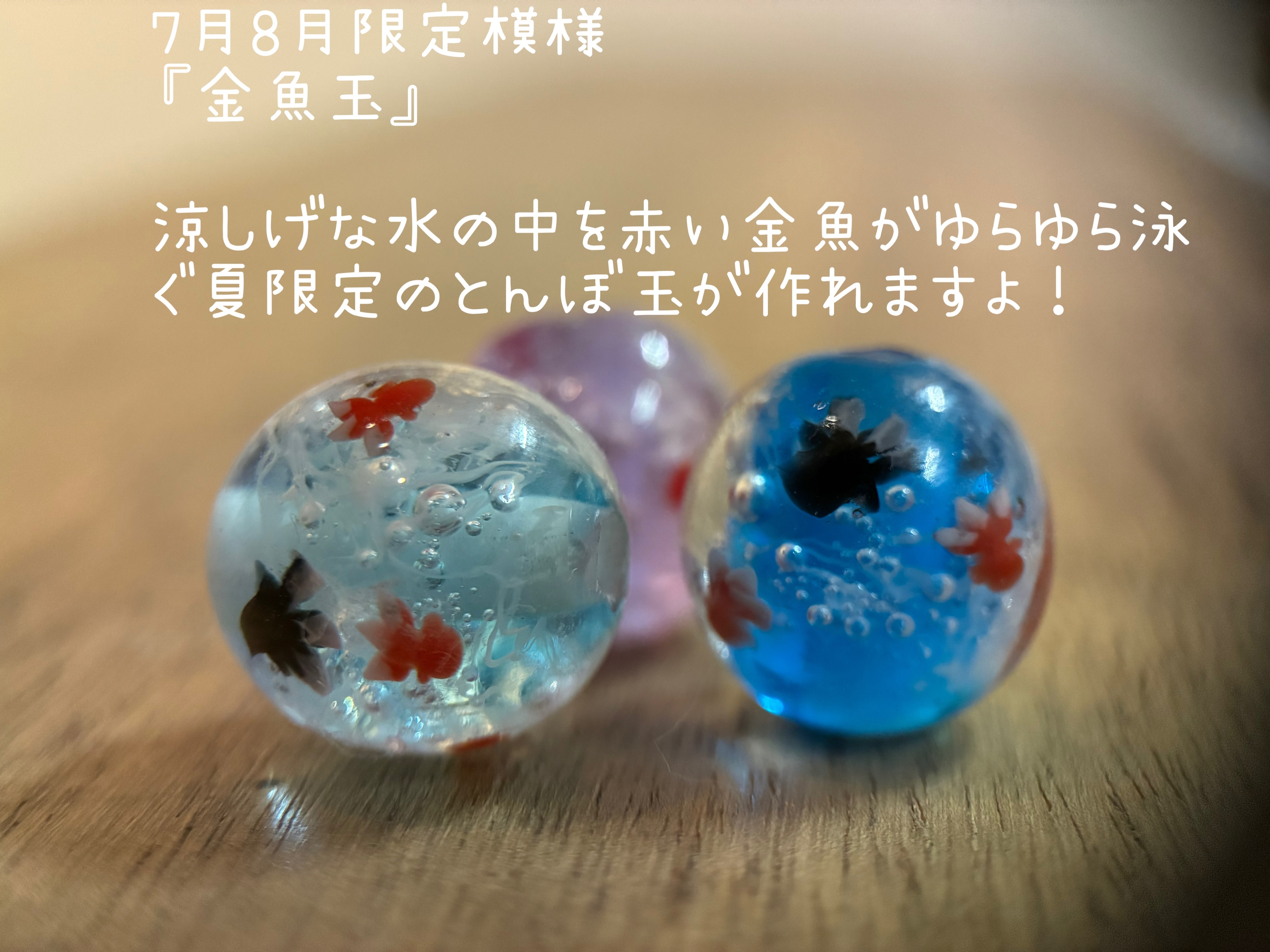 涼しげに泳ぐ金魚が愛らしい、夏祭り気分のとんぼ玉